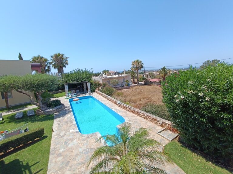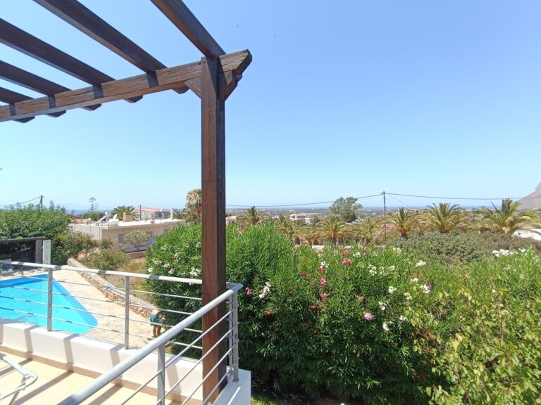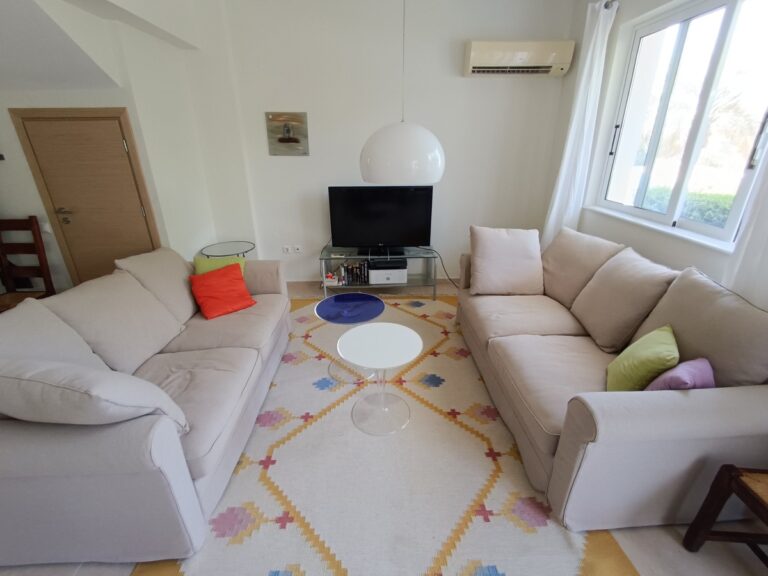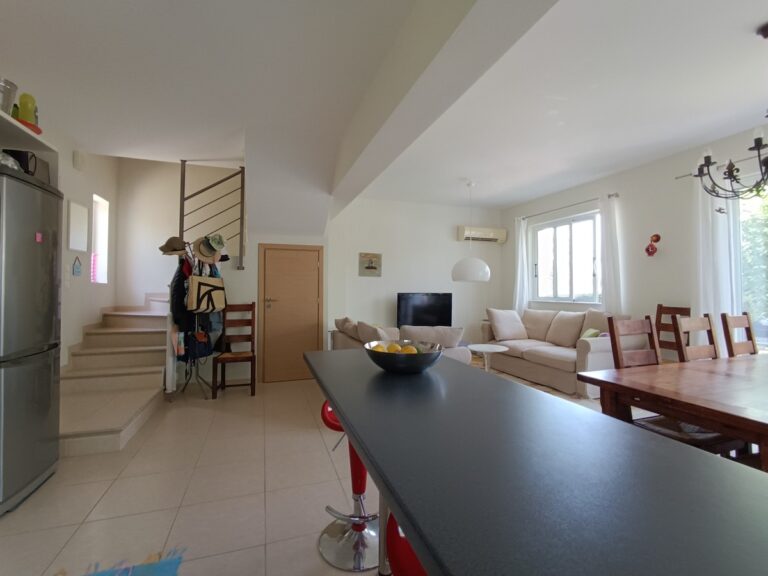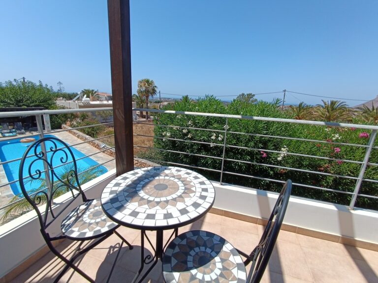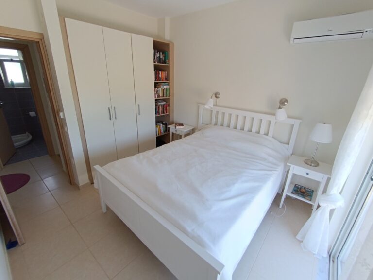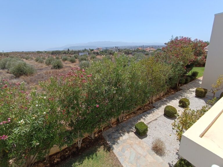This modern apartment for sale in Akrotiri, Chania, Crete, is located in the village of Chorafakia. It has a total living space of 97m² and it is part of a completed development of 5 homes. It spreads over 2 levels and consists of 3 bedrooms and 1 bathroom. The ground floor comprises a designer-fitted kitchen, a dining room, a cozy lounge and a storage room under the stairs. From there one has direct access to the beautiful garden and the swimming pool. Upstairs, there are 3 bedrooms with fitted wardrobes and one bathroom, but also a balcony offering spectacular views of the sea and the mountains.