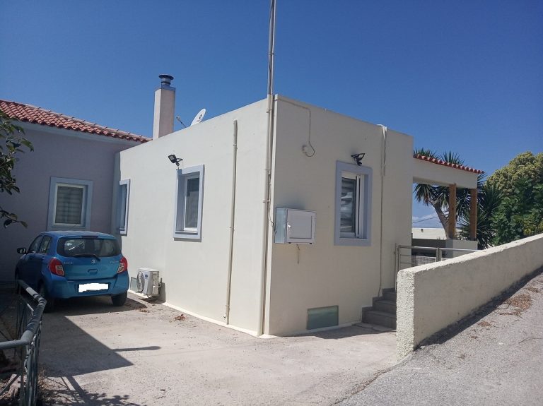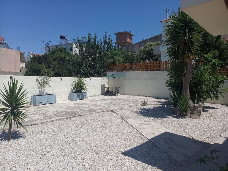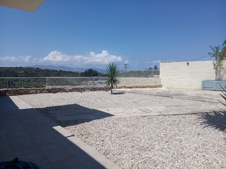 This is a fantastic house for sale in Platanias, Chania, Crete. It is located in Modi, a very peaceful and beautiful village close to the sea. The total size of the property is 349 sqms, with a living space of 164 sqms. It consists of 3 bedrooms and 2 bathrooms -one of them ensuite-, plus a WC for the guests. It is developed as a maisonette therefore it is arranged over 2 floors and it also features beautifully paved and landscaped yards at the side and in front of the house.