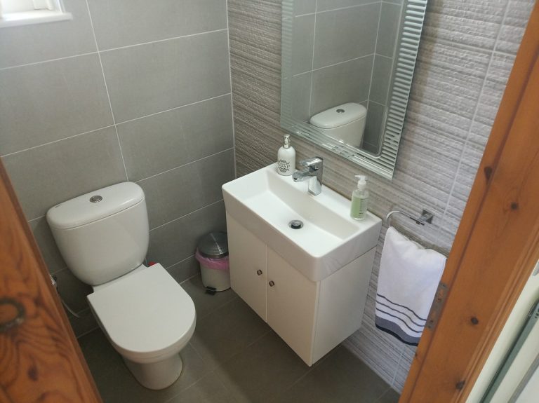 Taking the stairs to the lower floor, you will find all 3 bedrooms of the property together with an open hall area. The master bedroom is ensuite with a fitted wardrobe and a double bed and all rooms feature an A/C unit. From this floor you get to have access to another outside private terrace that is also landscaped with nice flowers and fruit trees. Over there, there is also a small room that hosts the tank and the machinery for the oil central heating system that the owners have installed on the property.