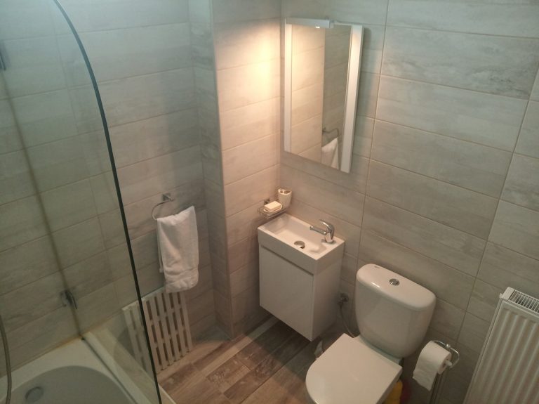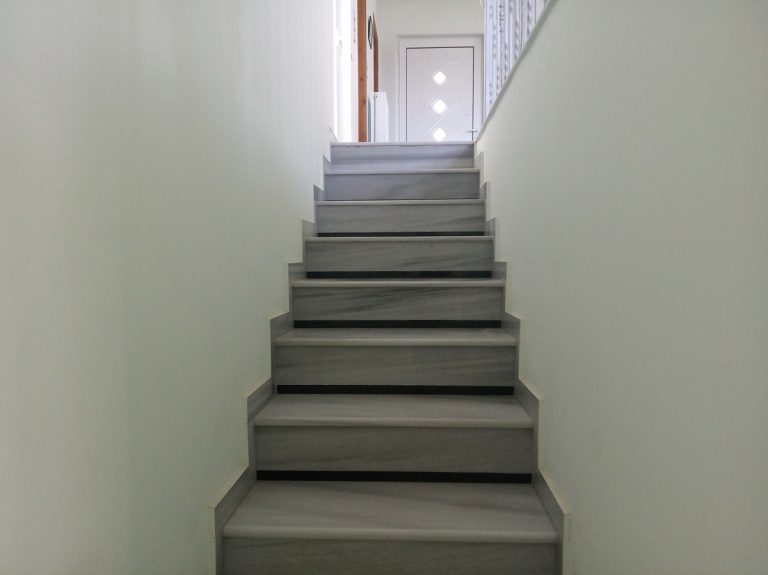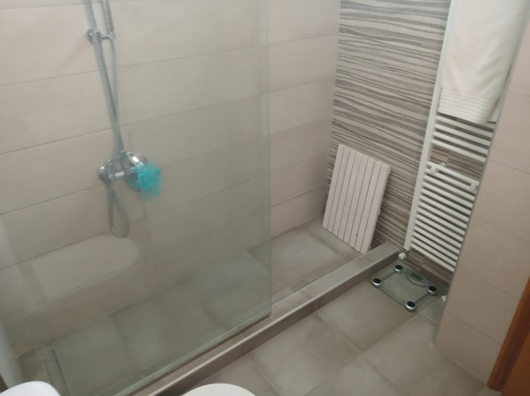 Entering the house, the first thing you encounter is a very spacious and airy room that hosts the lounge, open plan with the dining area. The living room features large and comfortable couches together with a nicely placed and cozy fireplace in the middle of the room. There are a lot of windows present, making the property very bright, while keeping a cool breeze even in the hot days of summer. The kitchen has a separate room that is connected with the dining area through a discreet arch. The kitchen is also fully equipped with modern fittings and a lot of cupboards in place for extra comfort and storage. This is definitely a great space to enjoy cooking while looking at the views towards the hills from the window. On top of that, on this floor you also get direct access to the main veranda of the house, where you can enjoy very relaxing views to the hills and the sea.