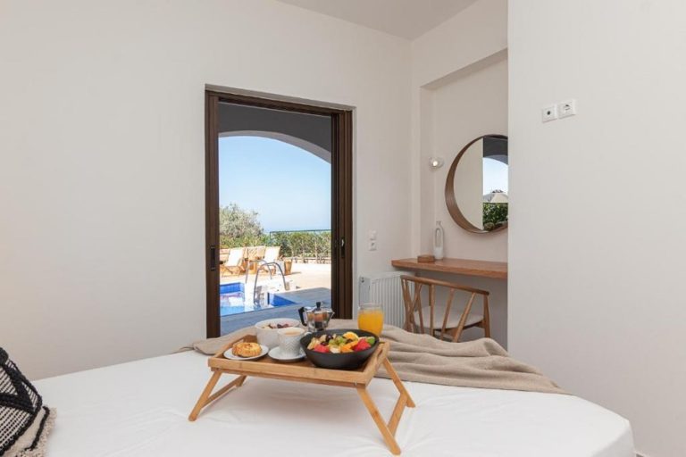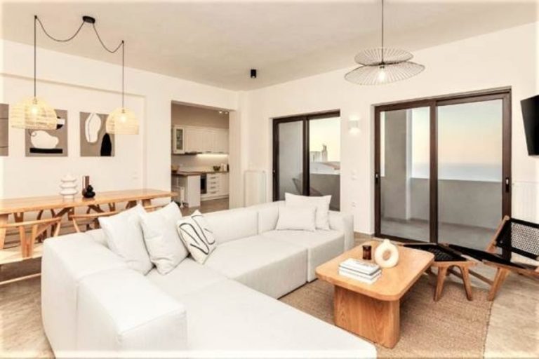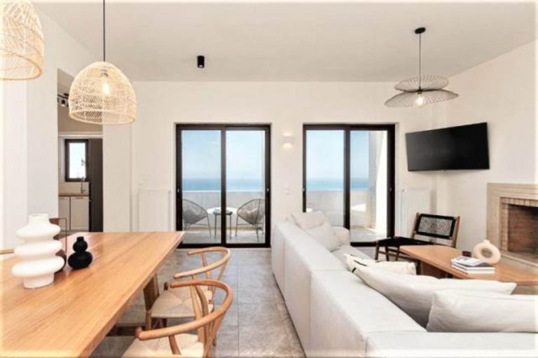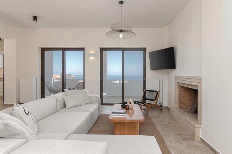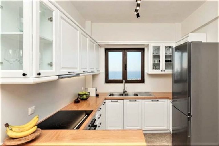 The main lounge and dining area are situated on the first floor of the property, with direct access to the balconies from which you may enjoy the unobstructed sea views that the location has to offer. In this area, there is a large flat-screen TV and a very cozy and fully functional fireplace that decorates the living room, while, on the same floor, you may also find the kitchen area with lots of storage space due to its many cupboards, with a greatly placed window above the sink that overlooks to the blue colours of the sea.