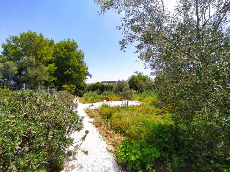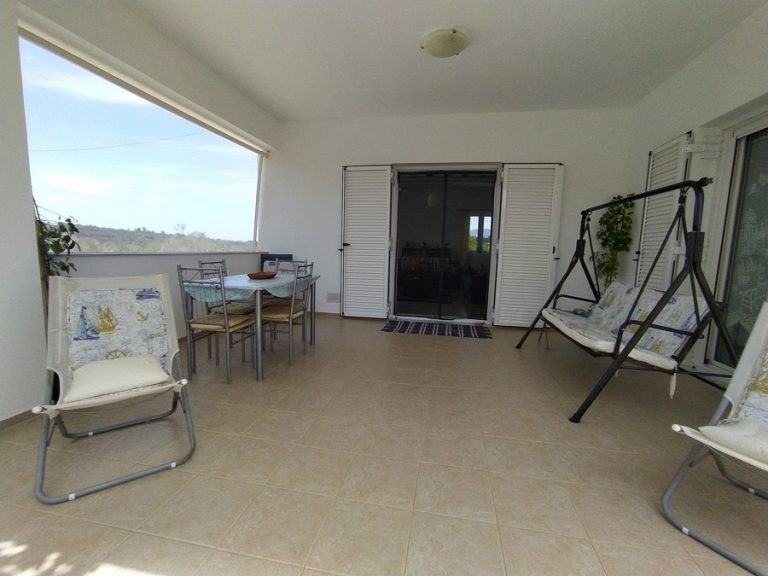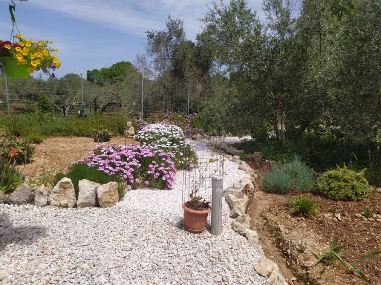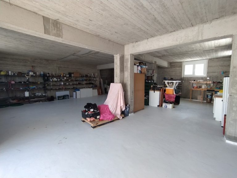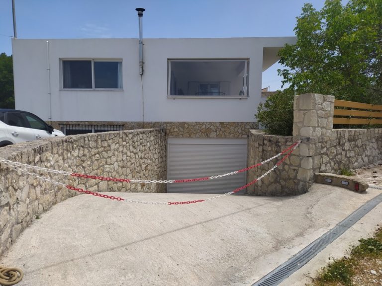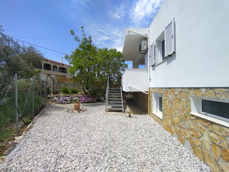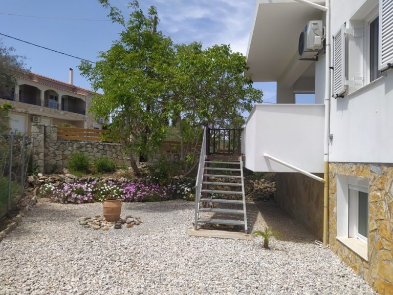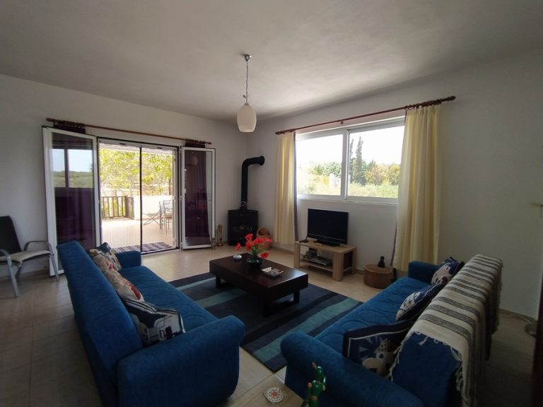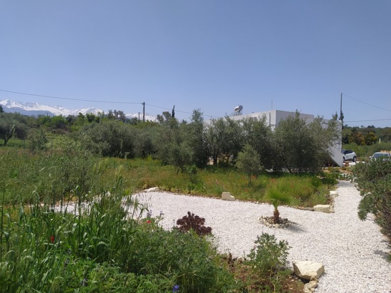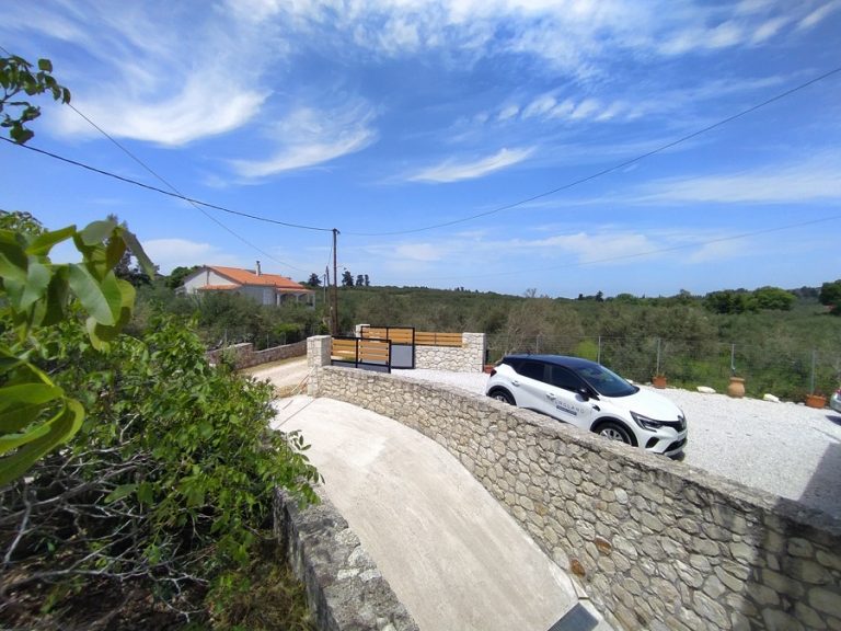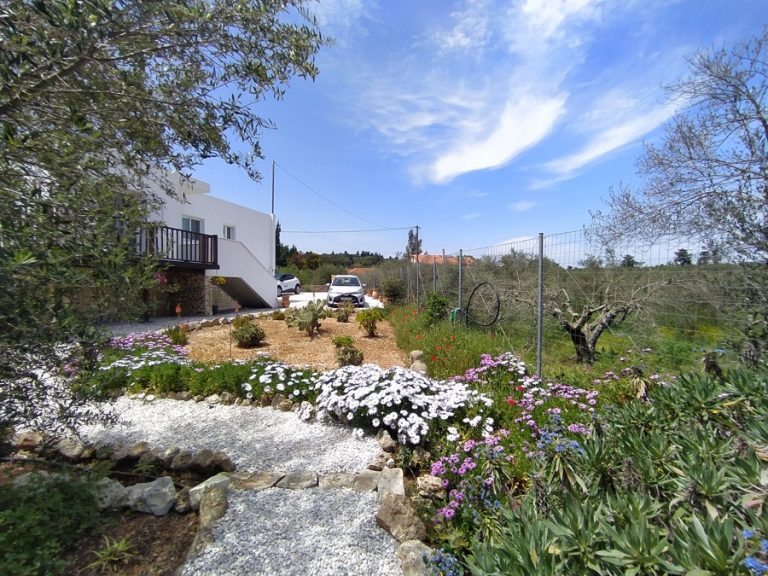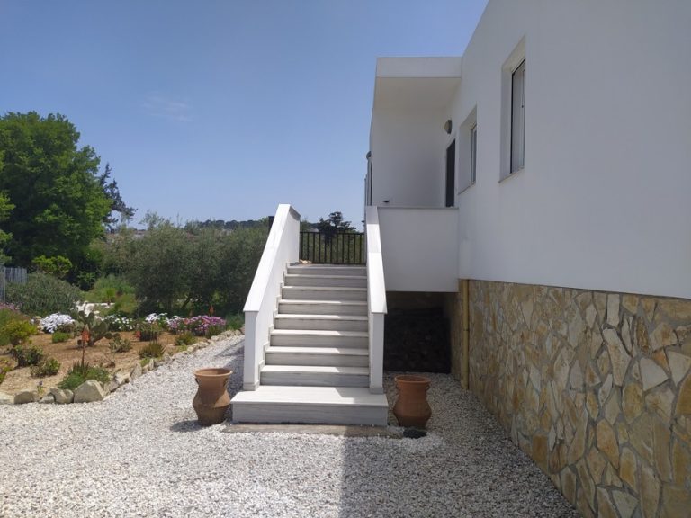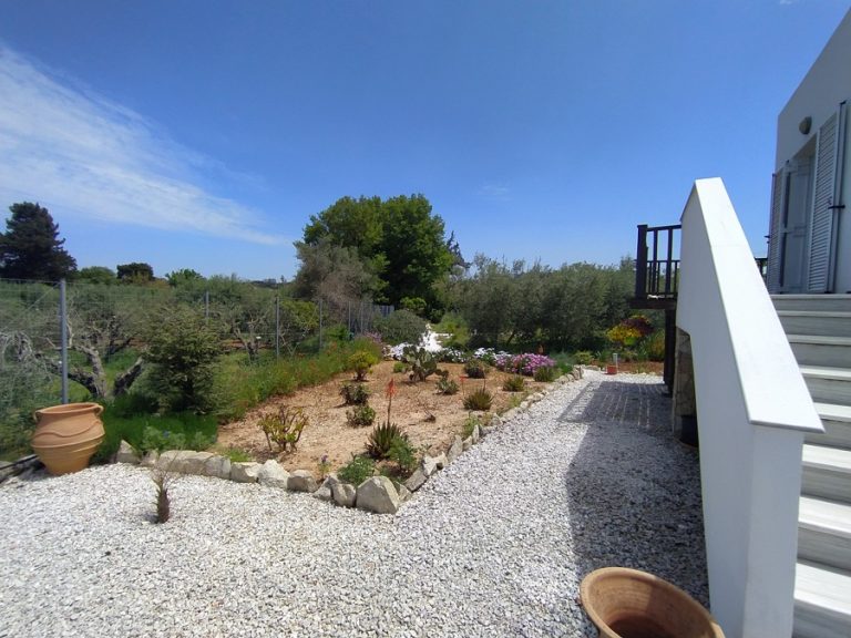 Built on a 1,200 sqm plot, the villa is in a very quiet, private location. It has entrance gates and a really pretty garden with mature trees, wildflowers, and shrubs. It is surrounded by fields and olive groves.