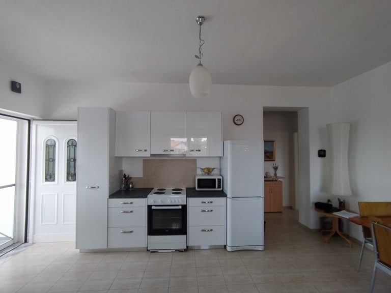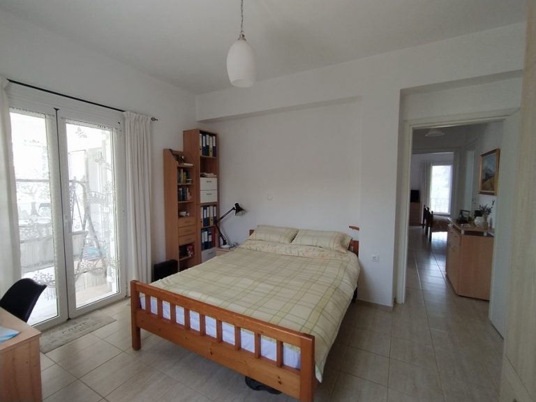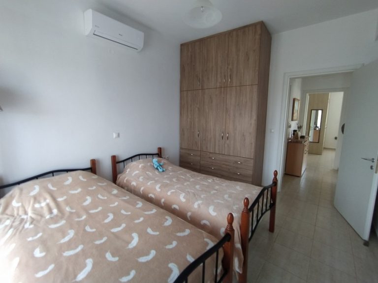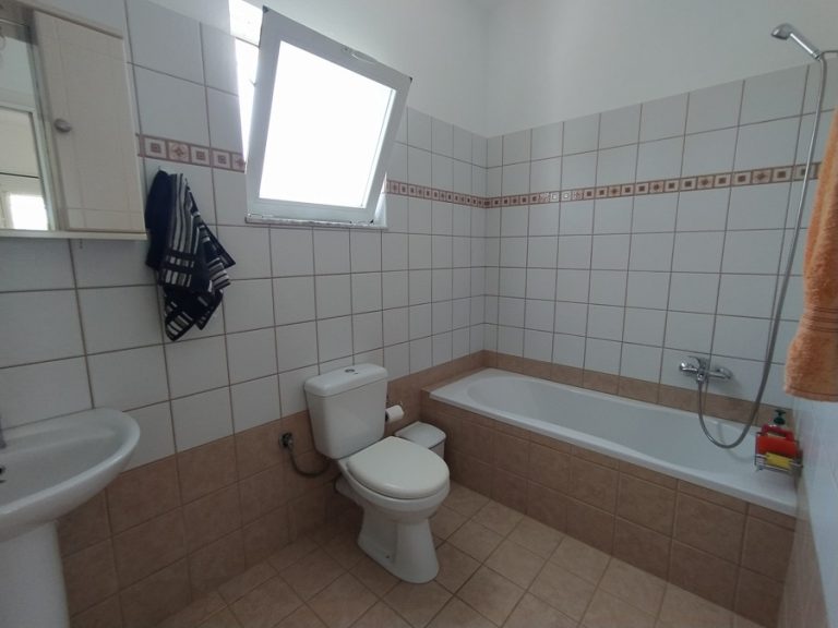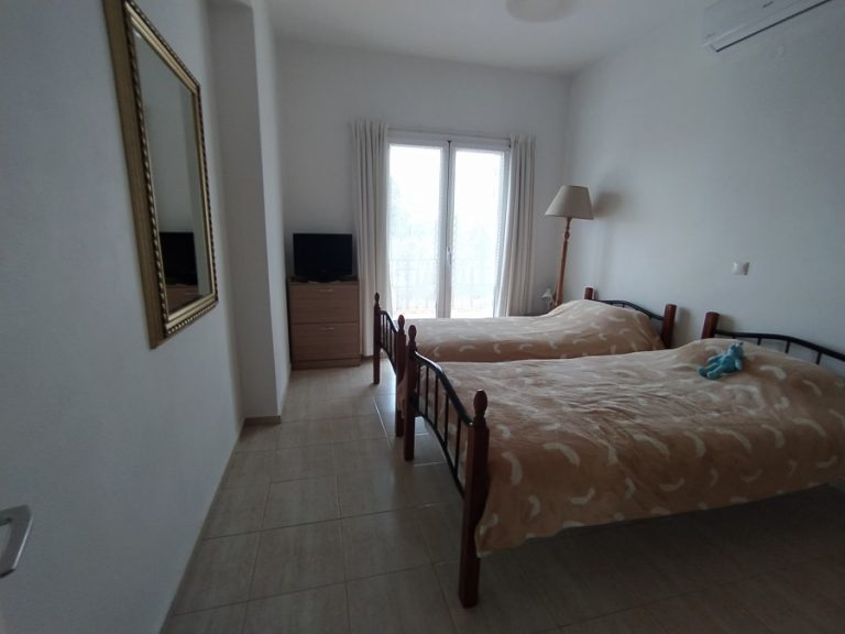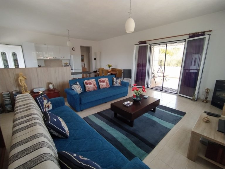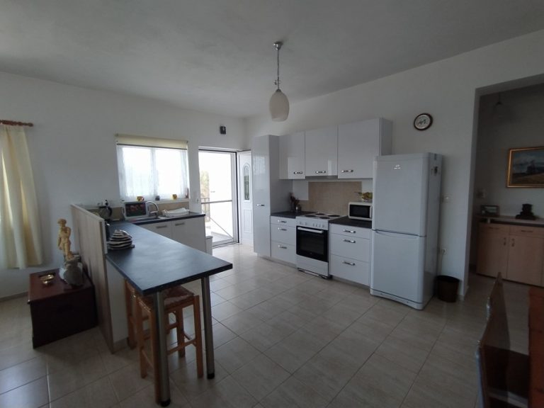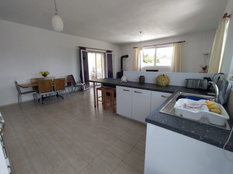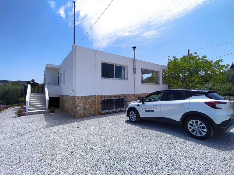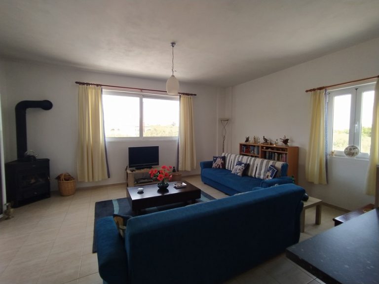 The lower level is actually an elevated basement, with large windows giving plenty of natural light. The closed garage, is accomodated there too, whereas there is enough space to create an extra study, a workshop, a bedroom or even a whole apartment. The property has been fully renovated last year and its kitchen is brand new. There is also plenty of space to add a swimming pool or an extra entretainment area. It has been equipped with solar panel, air-condition units for cooling & heating and a wood-burning stove, which heats up the whole house in a fully adequate way. Additionally, there is ready pipework for the installation of central oil heating. The property is suitable as a year round living property as well as a holiday home. It is offered for sale fully furnished and equipped. The square of Vamos, with all kind of amenities can be reached at a walking distance and the closest beach is just 7 kms away.