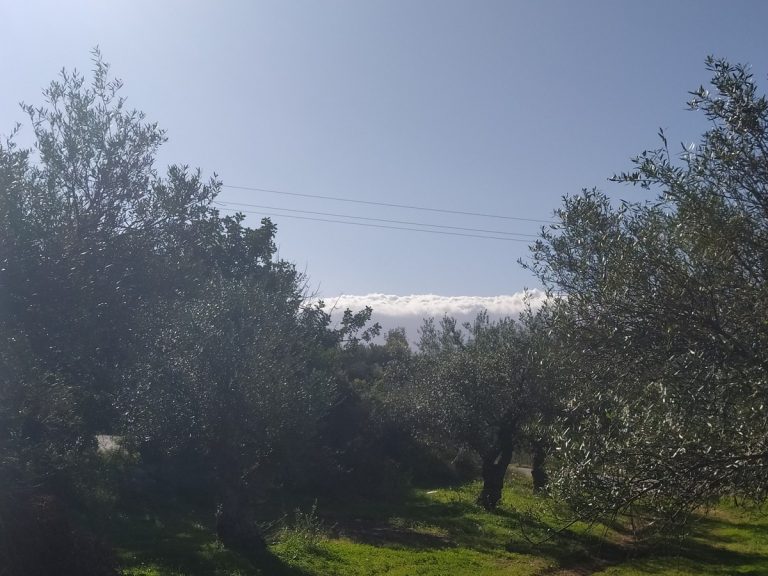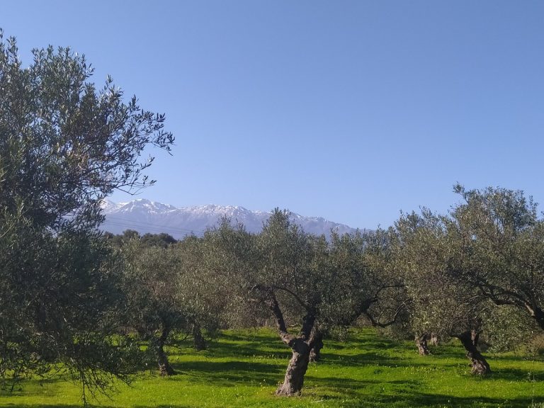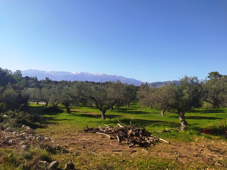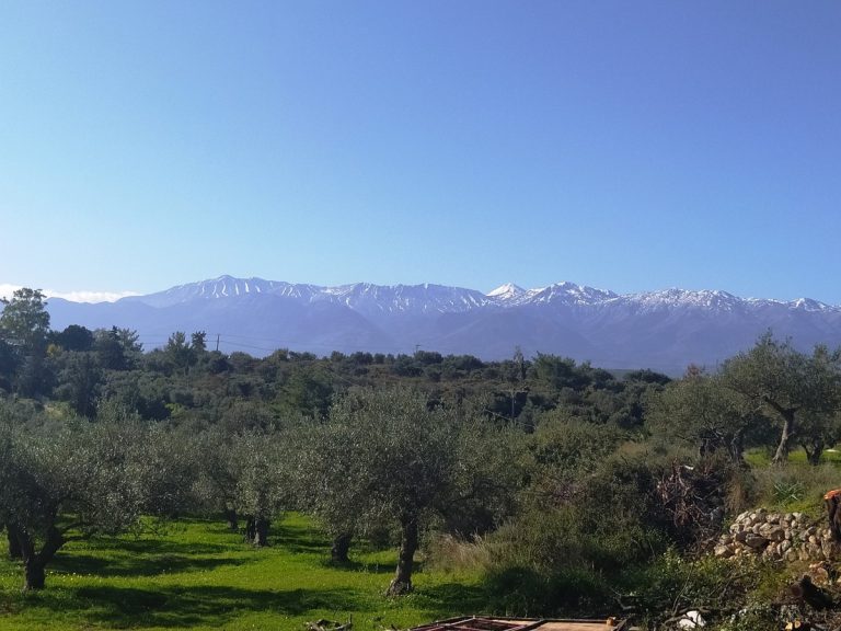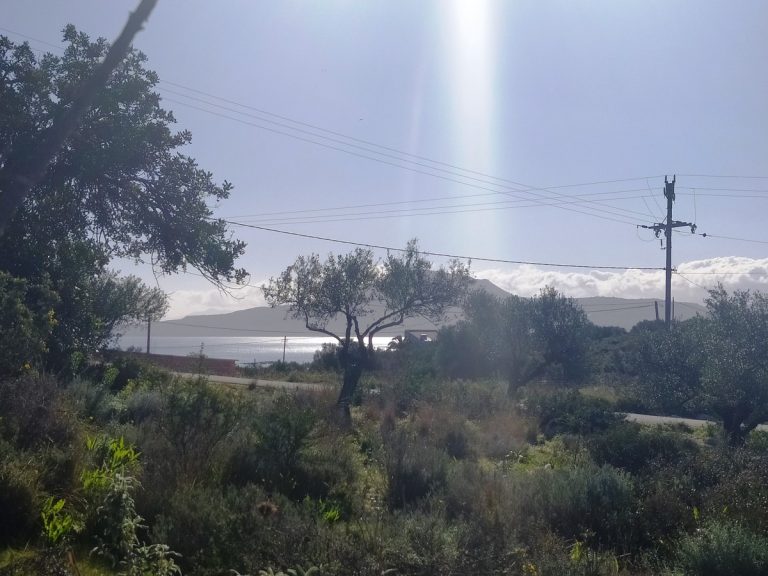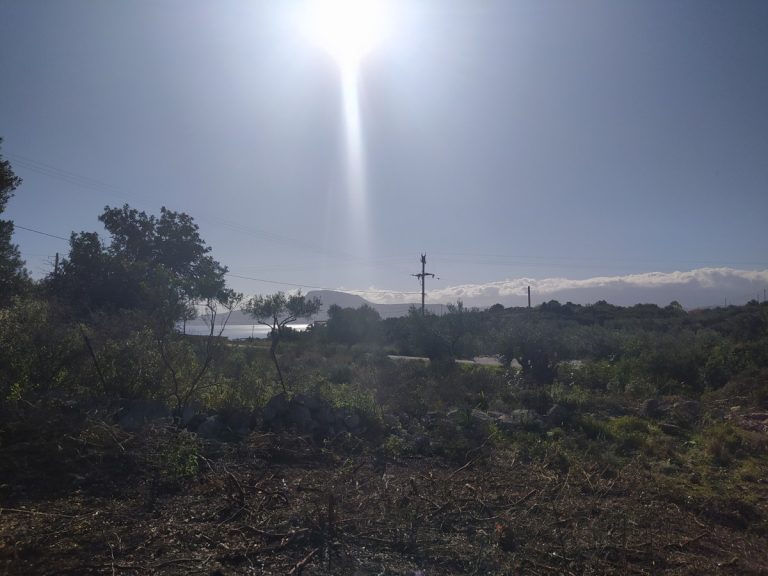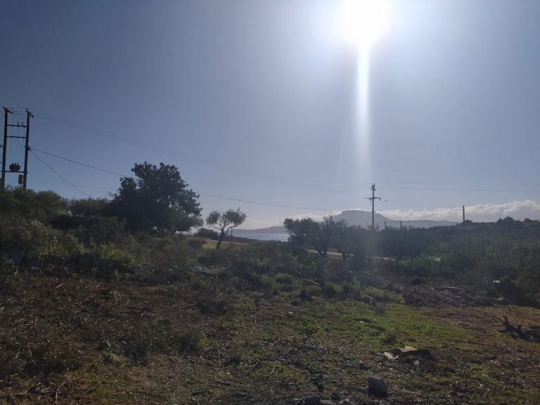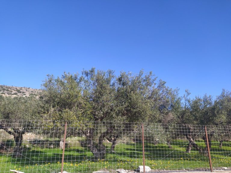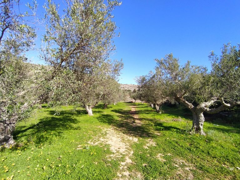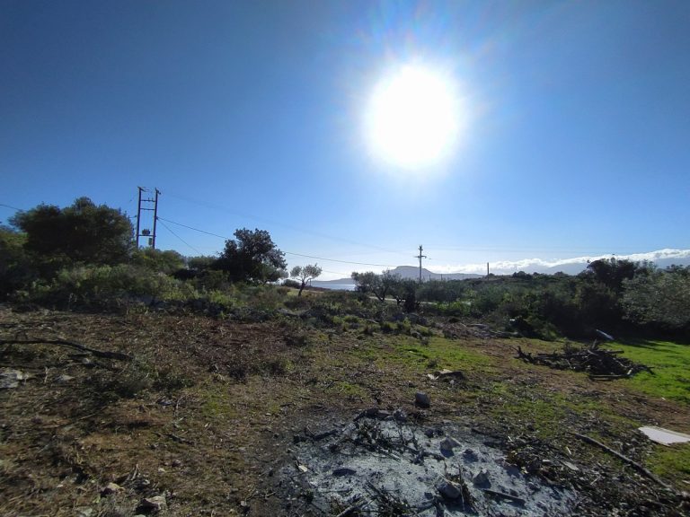 The plot is elevated, has open views to the sea and right now it has olive trees inside.
