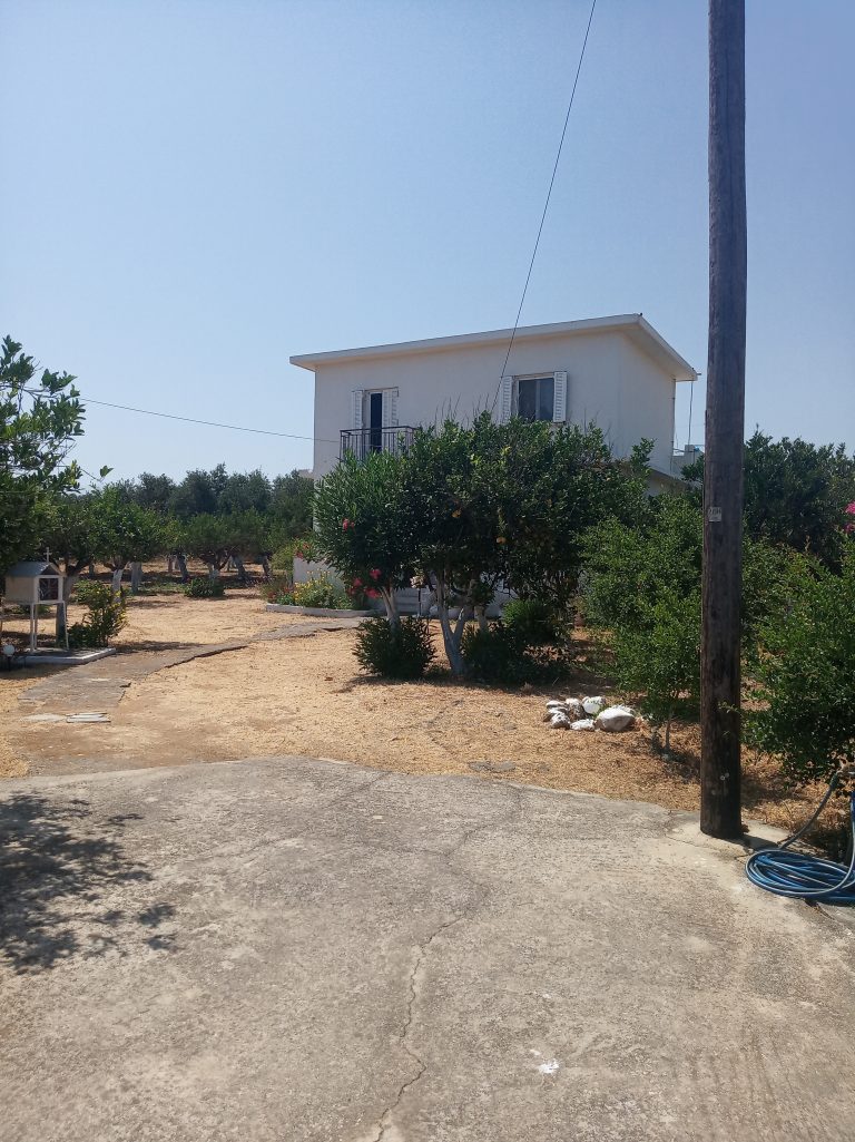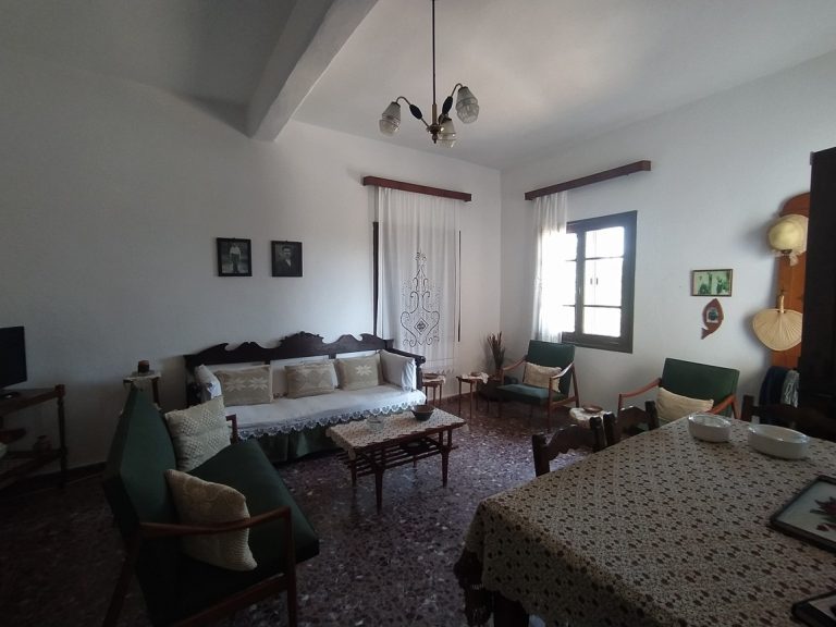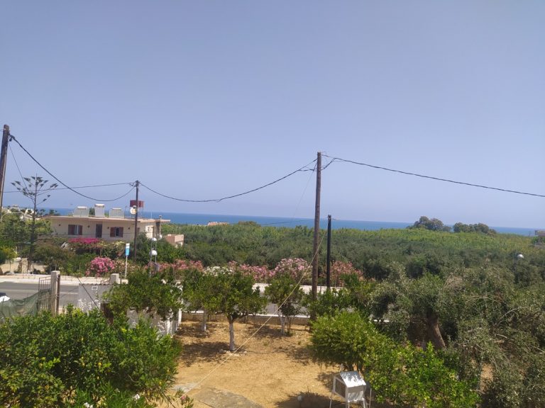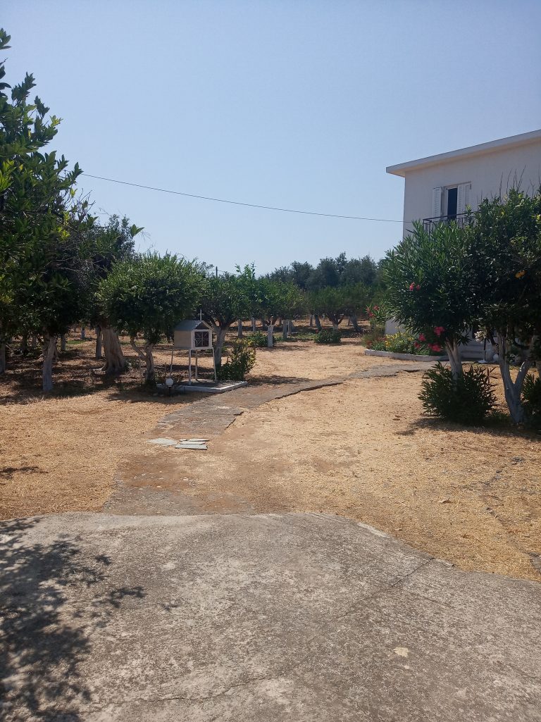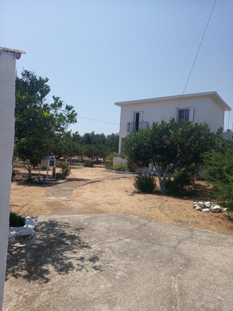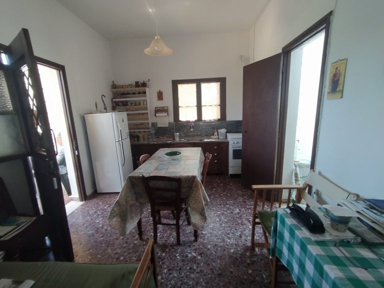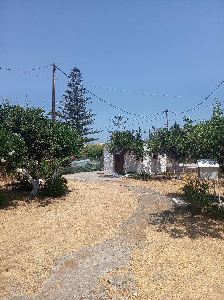 The ground floor level living space has a living room, a kitchen and an enclosed traditional Cretan patio with a water basin and storage space.