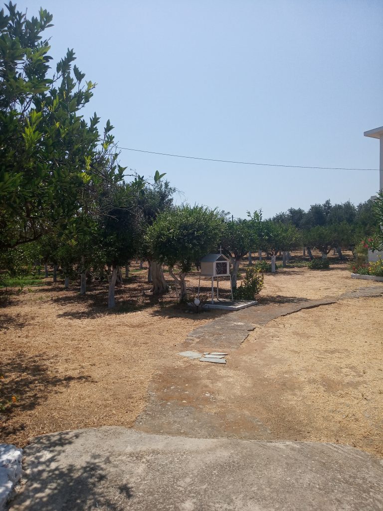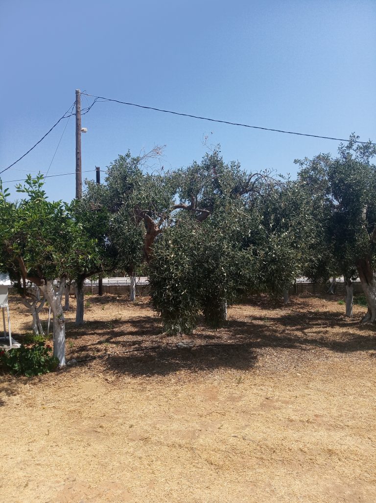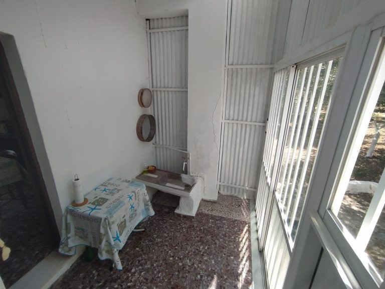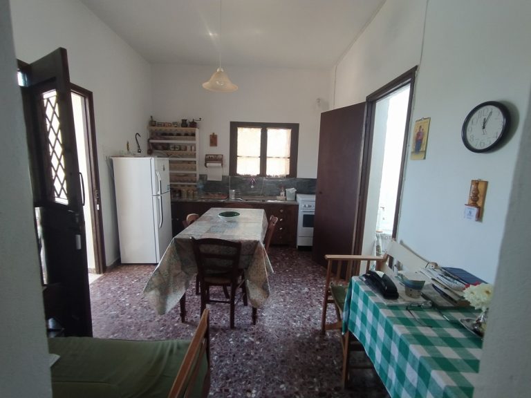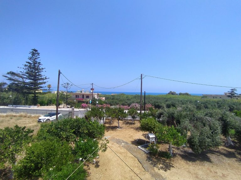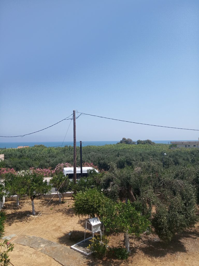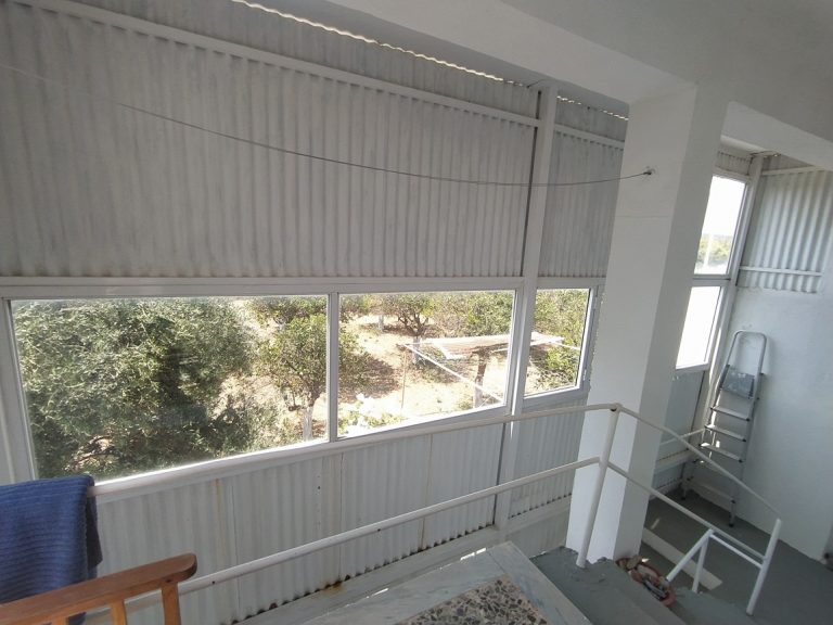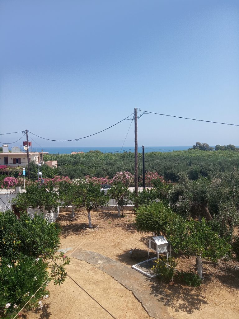 The ground floor level living space has a living room, a kitchen and an enclosed traditional Cretan patio with a water basin and storage space.