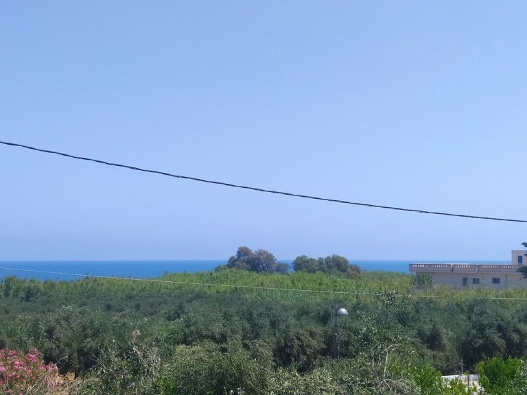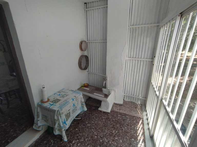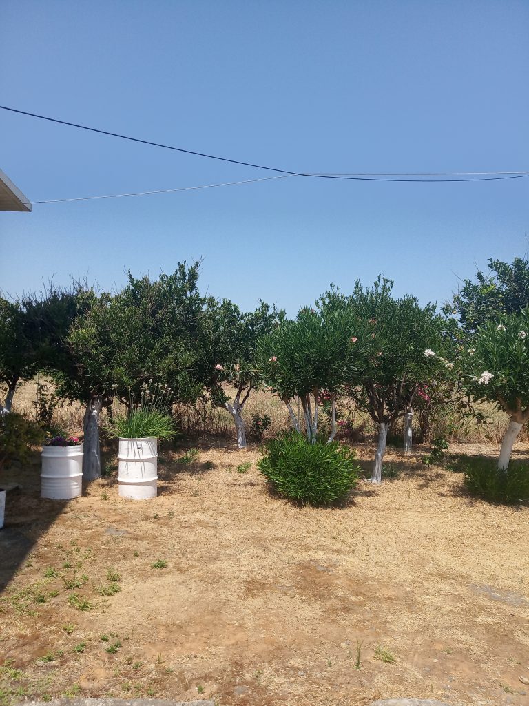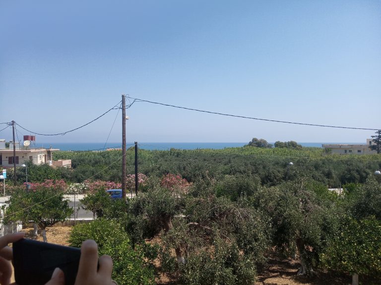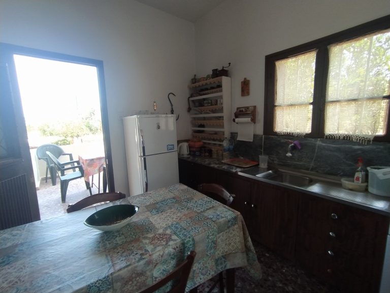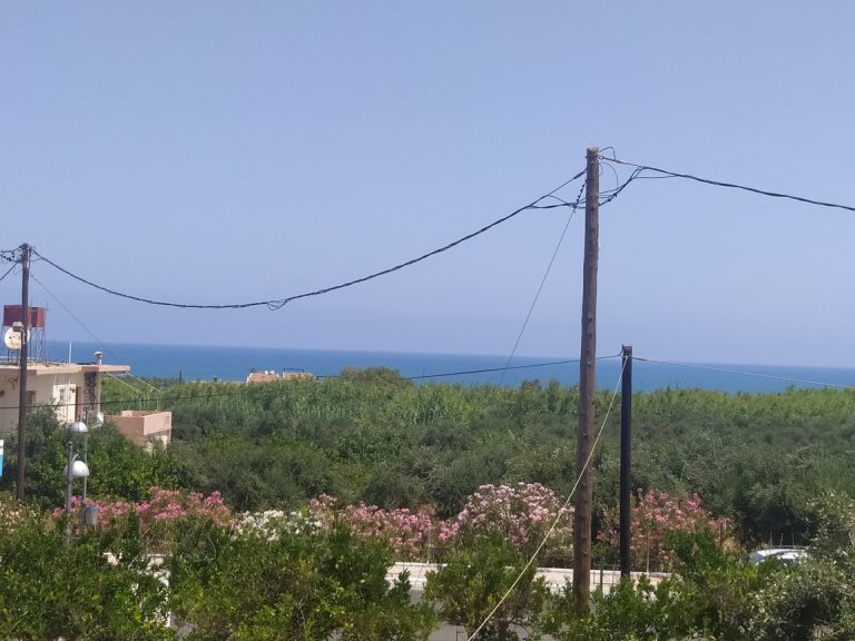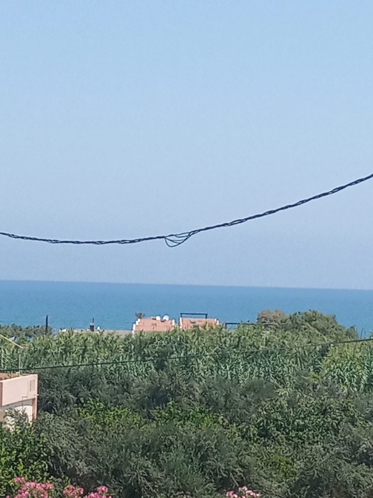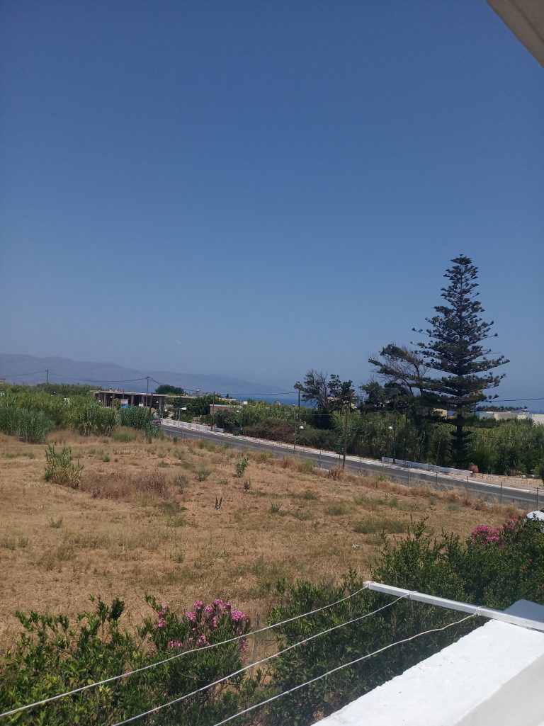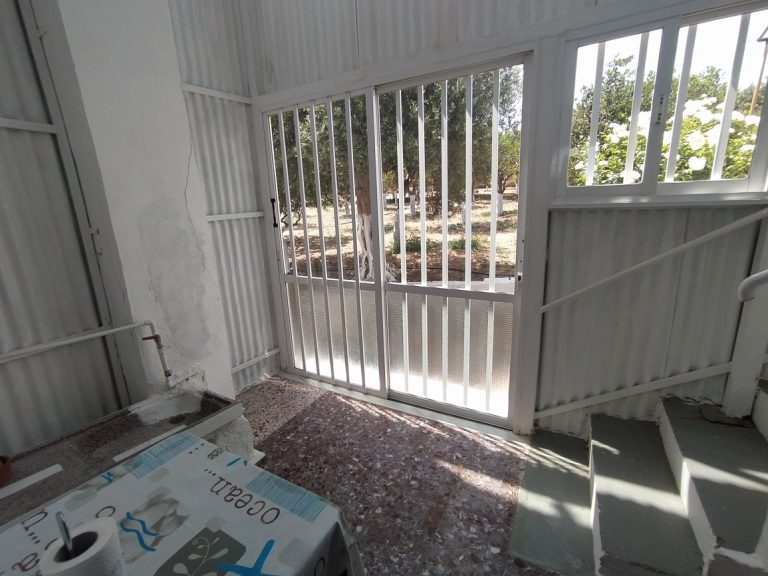 The ground floor level living space has a living room, a kitchen and an enclosed traditional Cretan patio with a water basin and storage space.