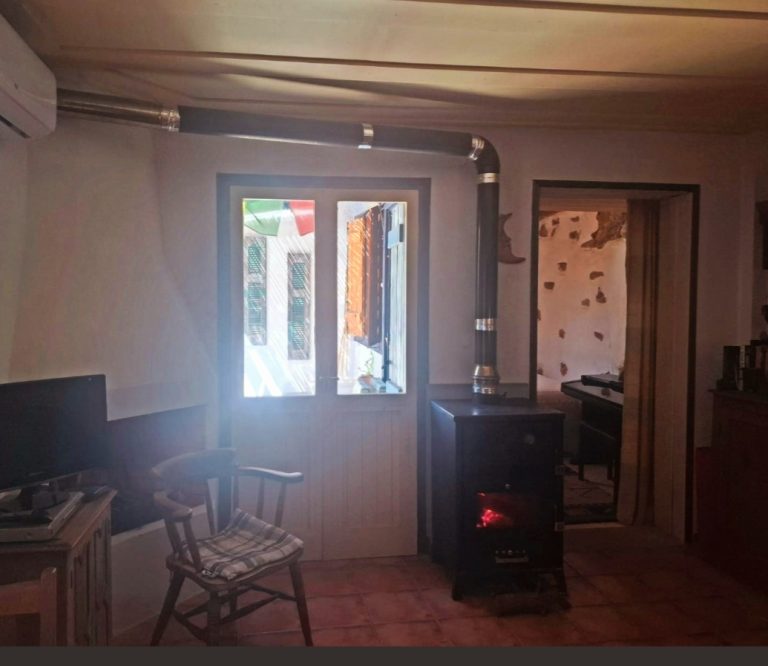 Upstairs, a bright double bedroom with french doors opens to a spacious balcony boasting scenic views of the sea and the White Mountains. The home also includes heating panels, an immersion heater, traditional wooden features, storage areas, and private off-road parking. It is being sold partly furnished, including kitchen appliances.