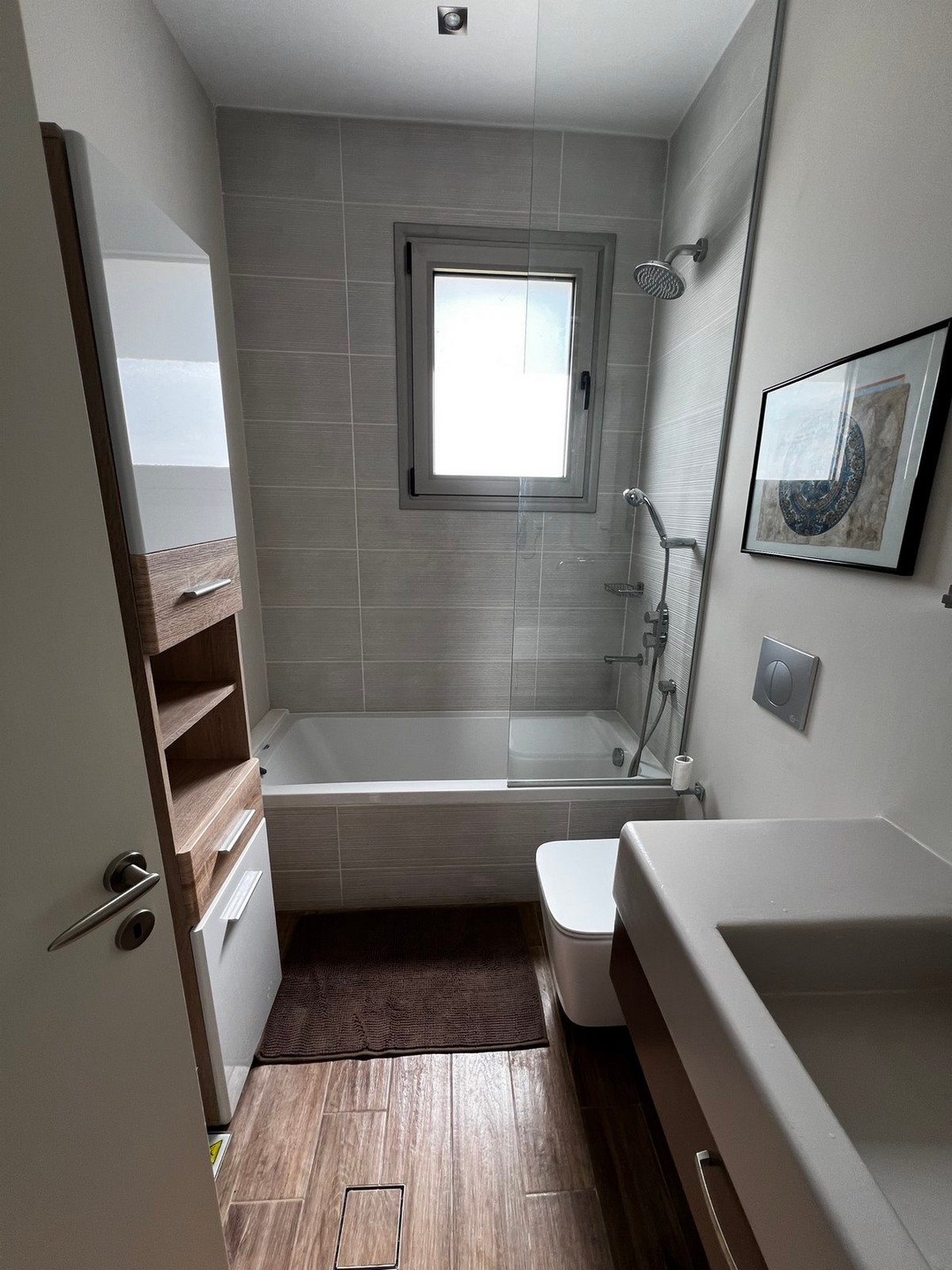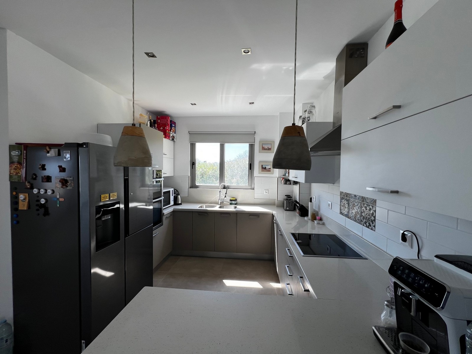 Built in 2021, the property spans 147 m² across two levels on a 1,563 m² plot. It features three bedrooms with en-suite bathrooms, a guest WC, a bright living and dining area with a fireplace, a modern fully equipped kitchen, and a separate laundry room. Large openings allow for plenty of natural light, creating a bright and airy atmosphere throughout.