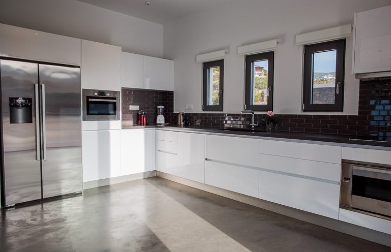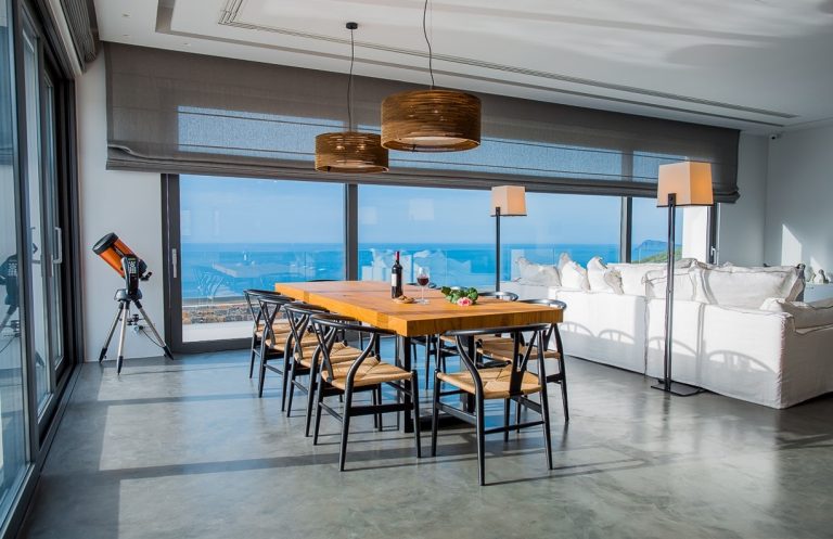 The villa can accommodate up to 10 people. Four en-suite bedrooms with panoramic sea views, in addition, there is a spacious open plan living room with a fully equipped modern kitchen and dining area surrounded by large glass windows offering incredible views. A small internal staircase leads to the second floor where the master bedroom is located. On the lower level is a second living room used as a game room with a home theater system.The spacious living room on the ground floor is surrounded by balcony doors that open onto sun terraces with a 90 sqm infinity swimming pool. and a covered dining area by the gazebo.